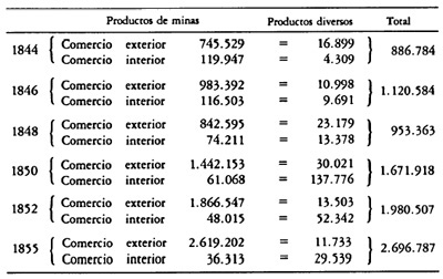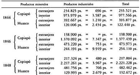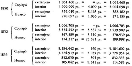 El año 1844, en que la estadística mercantil de Chile comienza a tener una forma regular, muestra, por los productos de Atacama y por su valor, en qué estado estaba entonces este ramo importante de nuestras riquezas territoriales(90). Los metales se pagaban a bajo precio. En los departamentos del sur, los minerales de plata comenzaban apenas a extraerse por el ensaye, y en Copiapó no se hacía de ellos mención alguna. Cuatro años después, a pesar de la prohibición de las relaciones comerciales con las provincias argentinas, se ven ya las proporciones que el comercio tomaba en el aumento de las producciones y en el alza de sus precios. El año 1851 vino a dar una nueva faz a este comercio y aunque el estado de las minas no sea, con mucho, tan brillante como en la época de su descubrimiento, el rendimiento es de día en día más considerable.